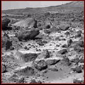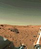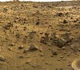 Μια τυπική είκόνα της επιφάνειας του Αρη. Οι πέτρες που βλέπετε έχουν πιθανότατα εκτοξευθεί κατά τις προσκρούσεις που δημιούργησαν τους κρατήρες. Η κοκκινωπή όψη της επιφάνειας οφείλεται στην παρουσία οξειδωμένου σιδήρου. Το ροζ χρώμα του ουανού οφείλεται στην εξαιρετικά λεπτή άμμο που βρίσκεται στην ατμόσφαιρα του Αρη.
